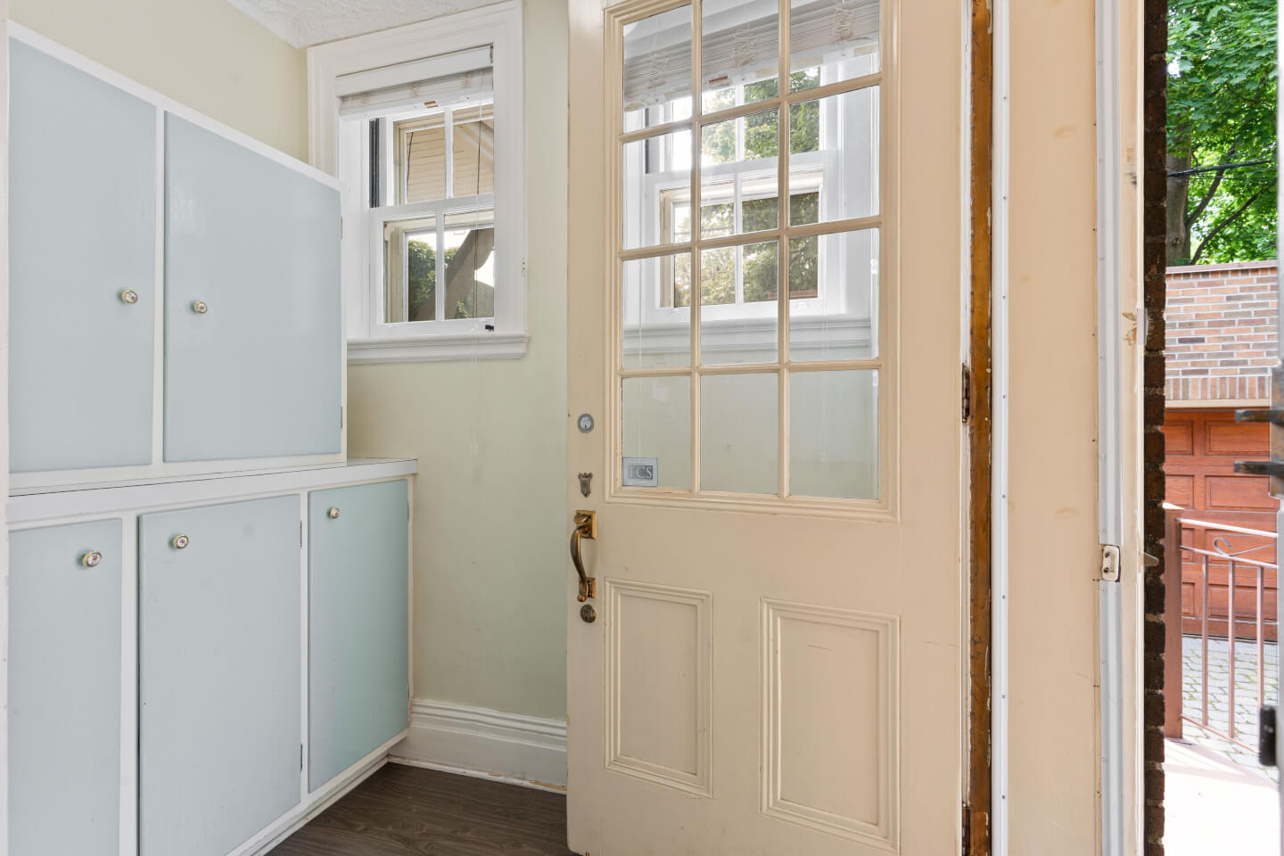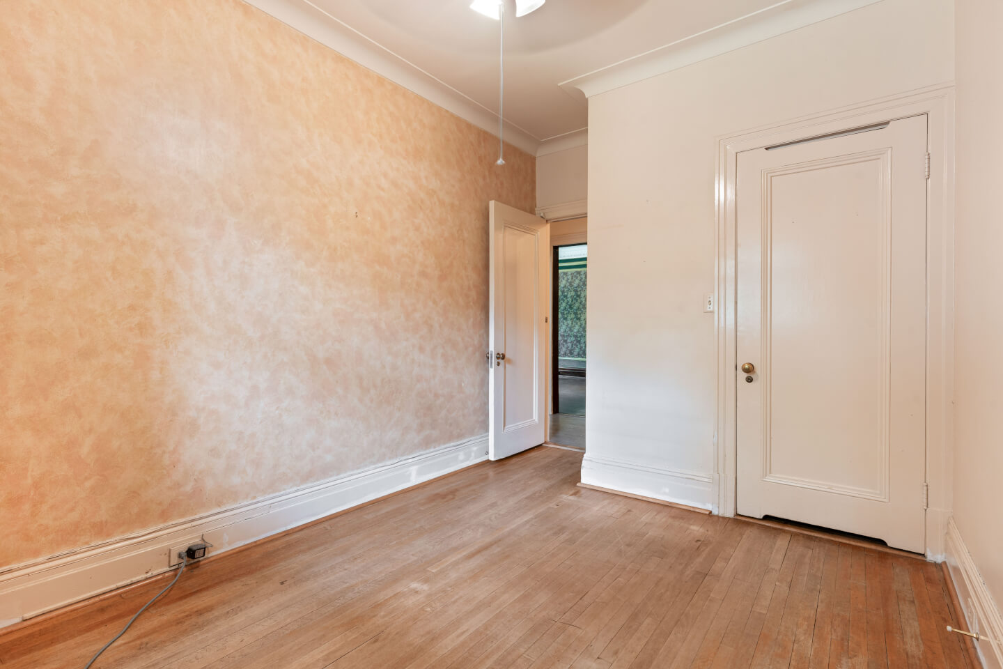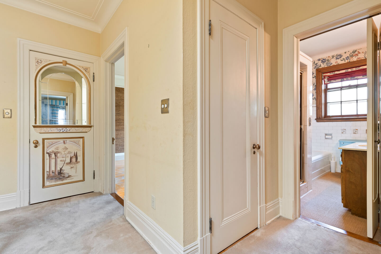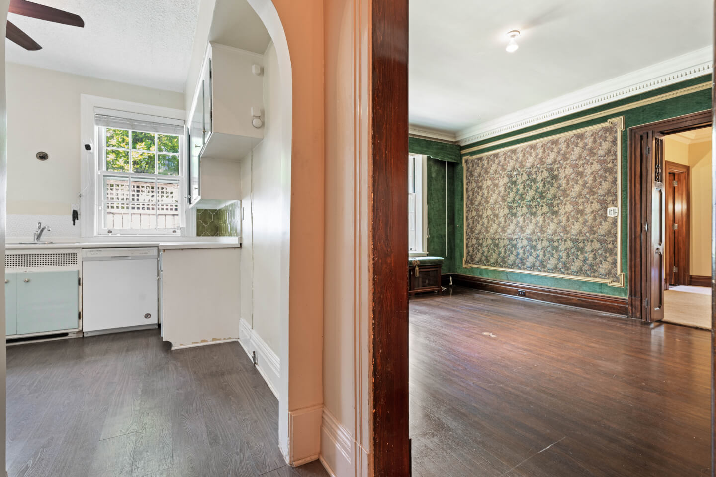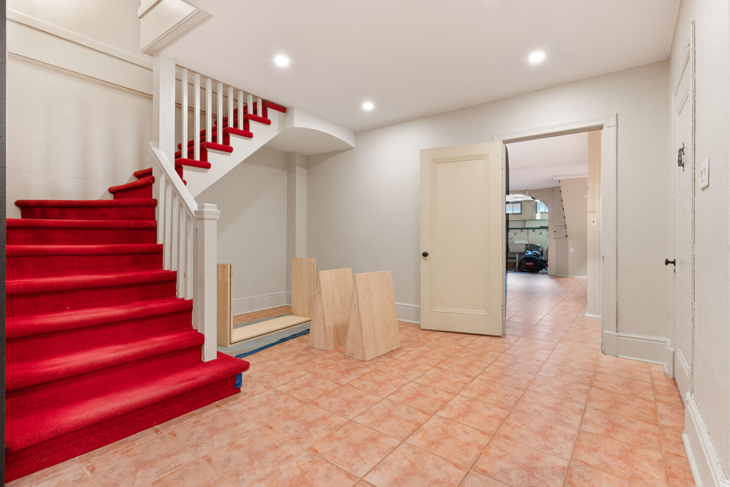 Salon élégant avec foyer d’origine, fenestration en baie, encastrés et portes françaises