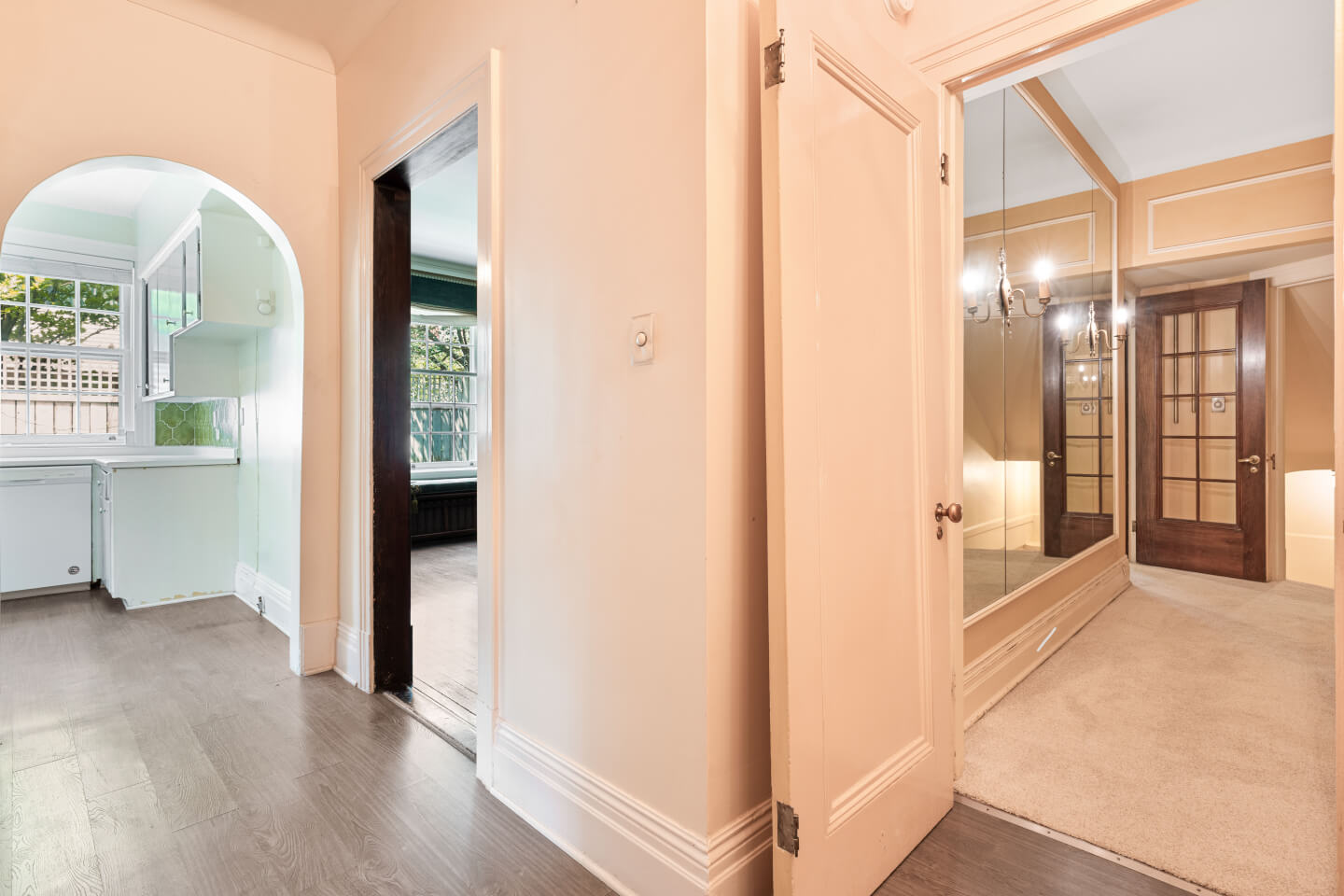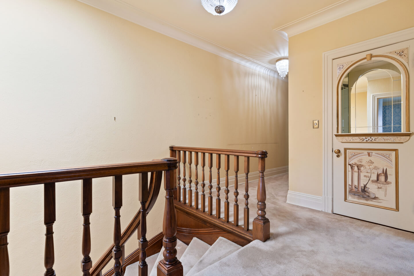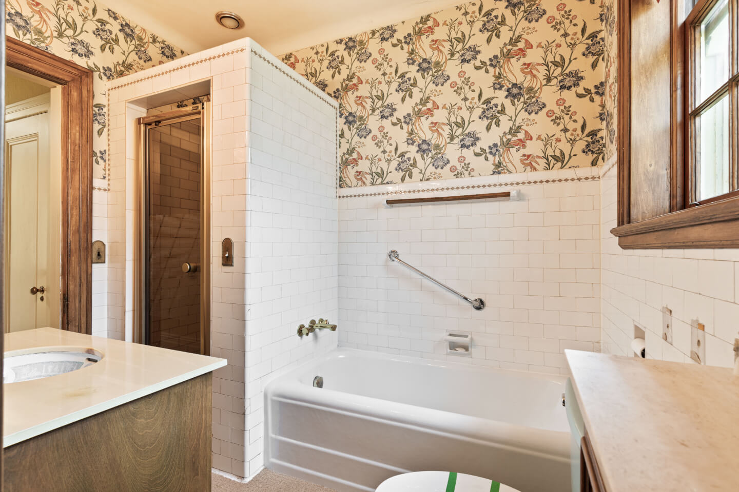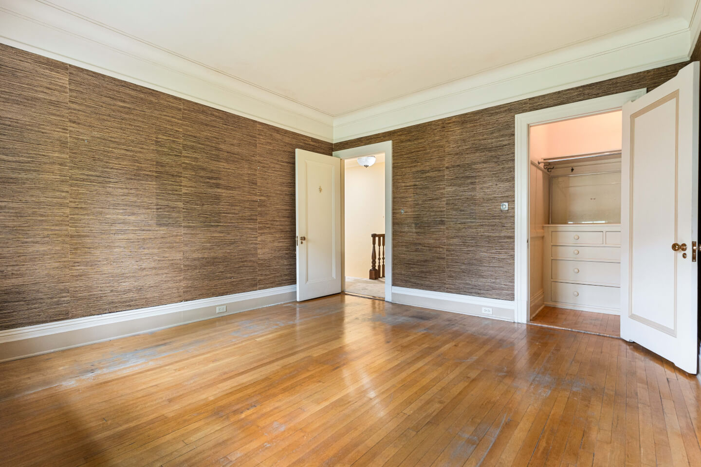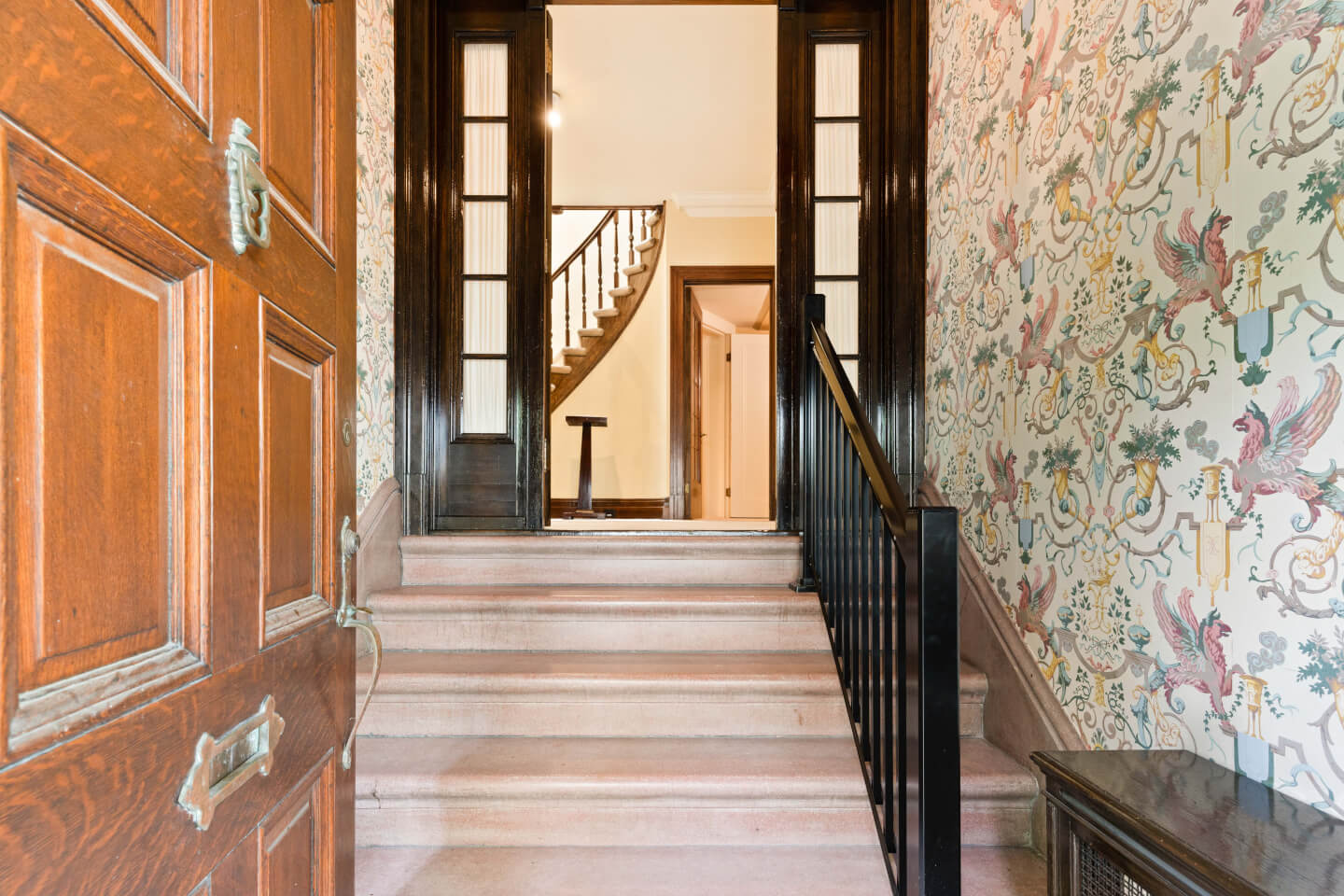 Salon élégant avec foyer d’origine, fenestration en baie, encastrés et portes françaises