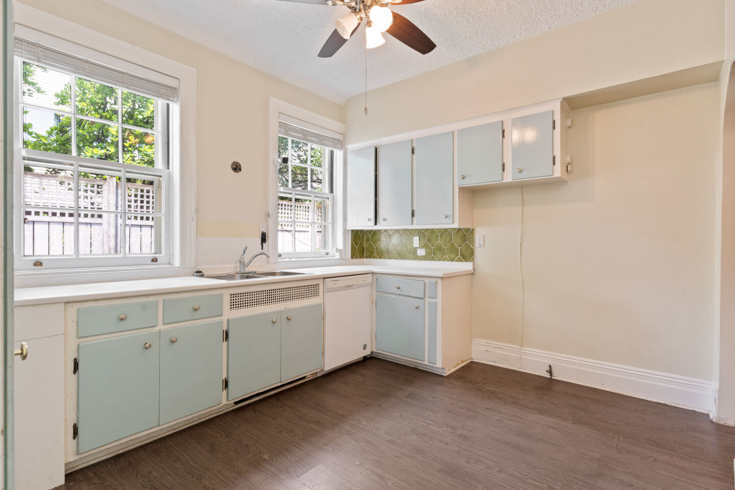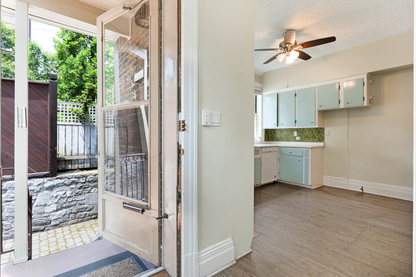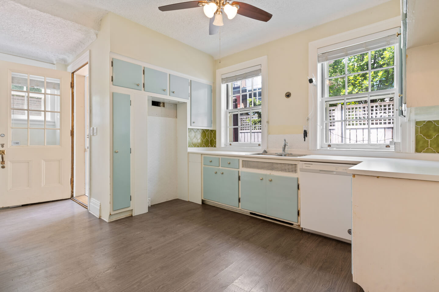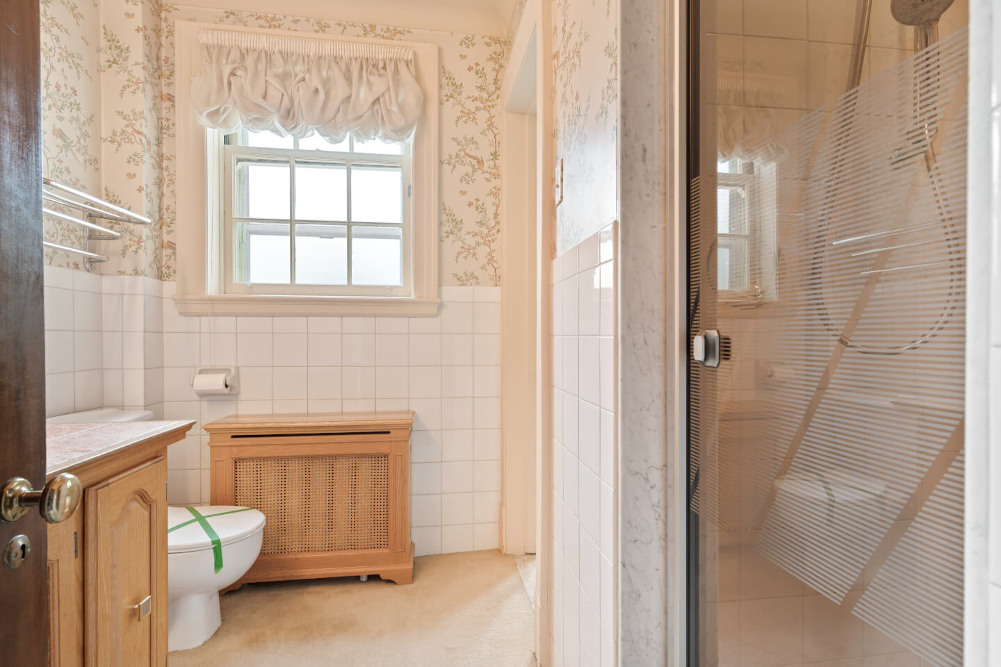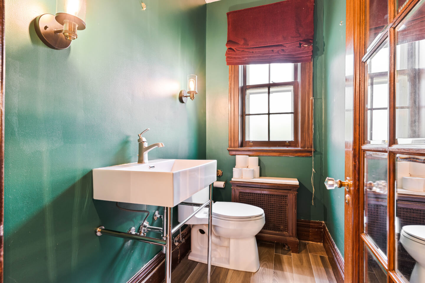 Salon élégant avec foyer d’origine, fenestration en baie, encastrés et portes françaises