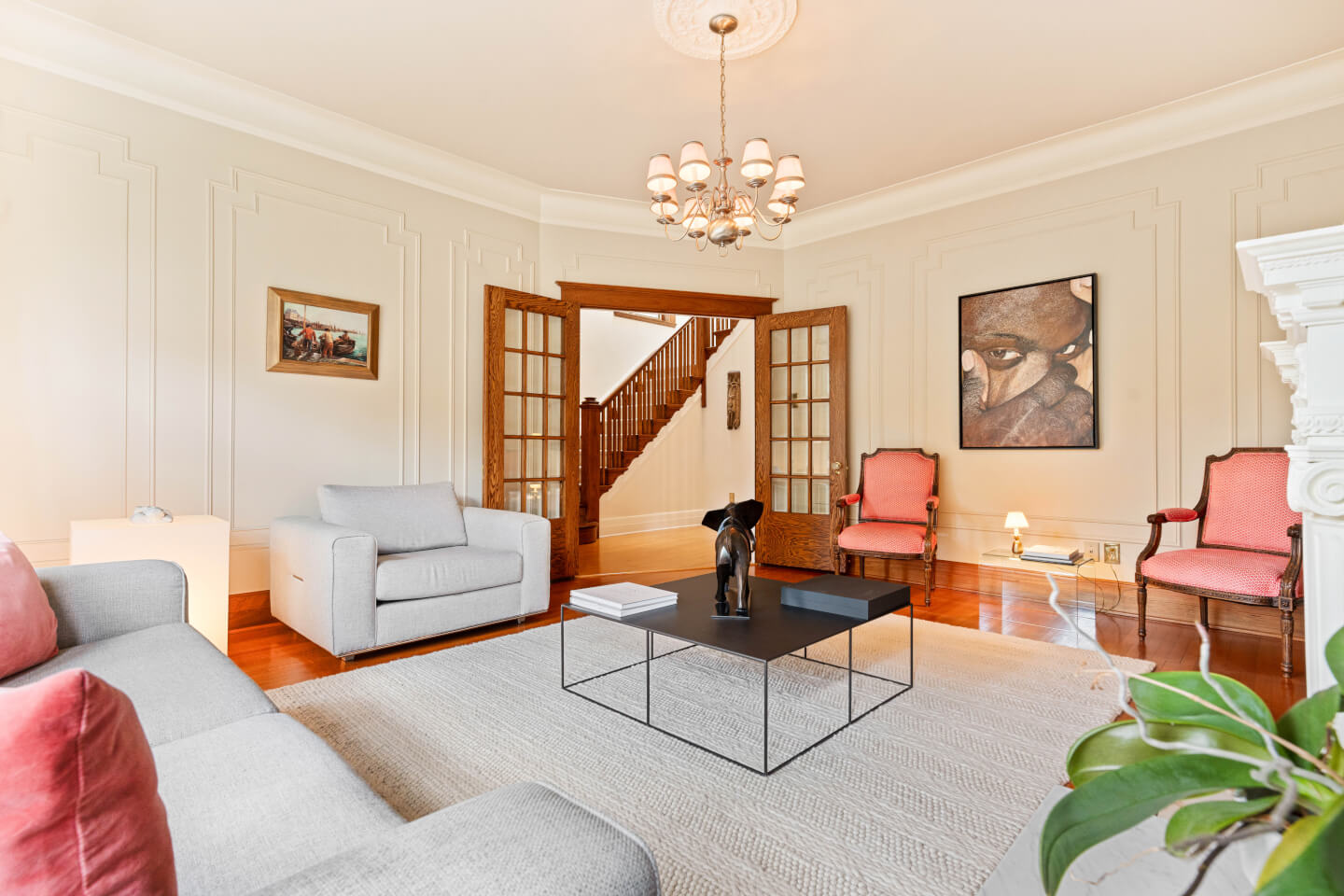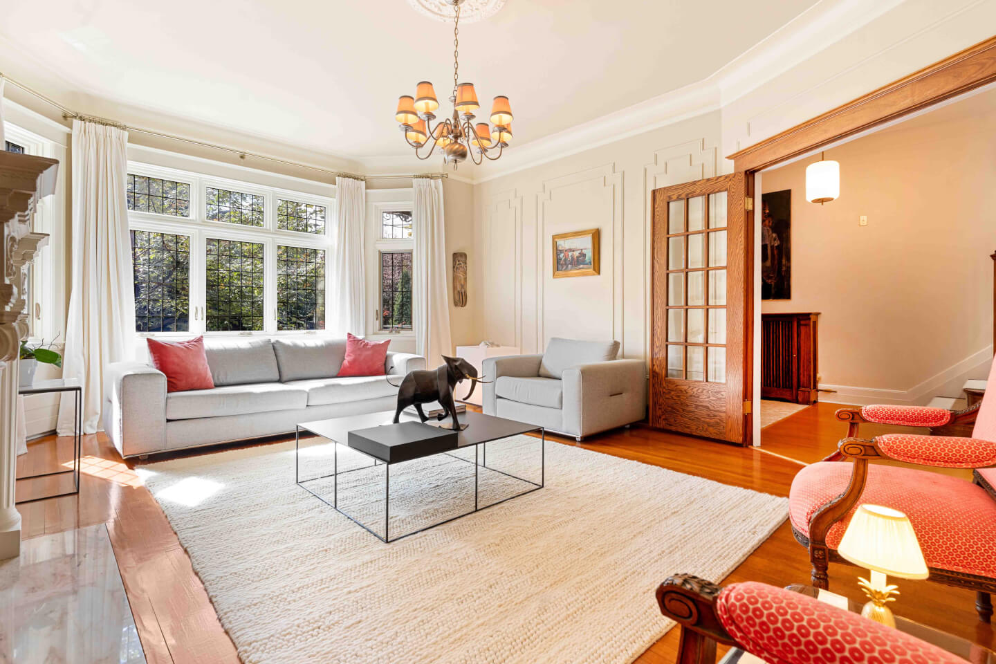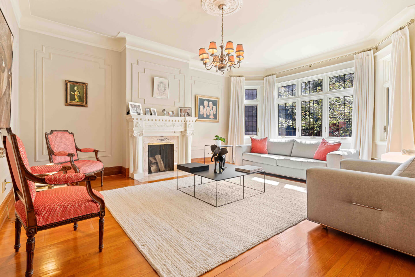 Salon, fenestration en baie, détails de moulures murales & foyer 1930