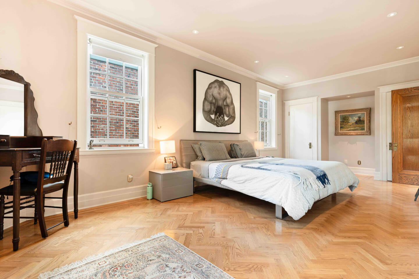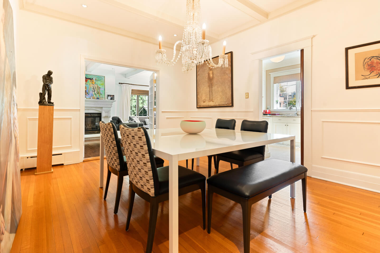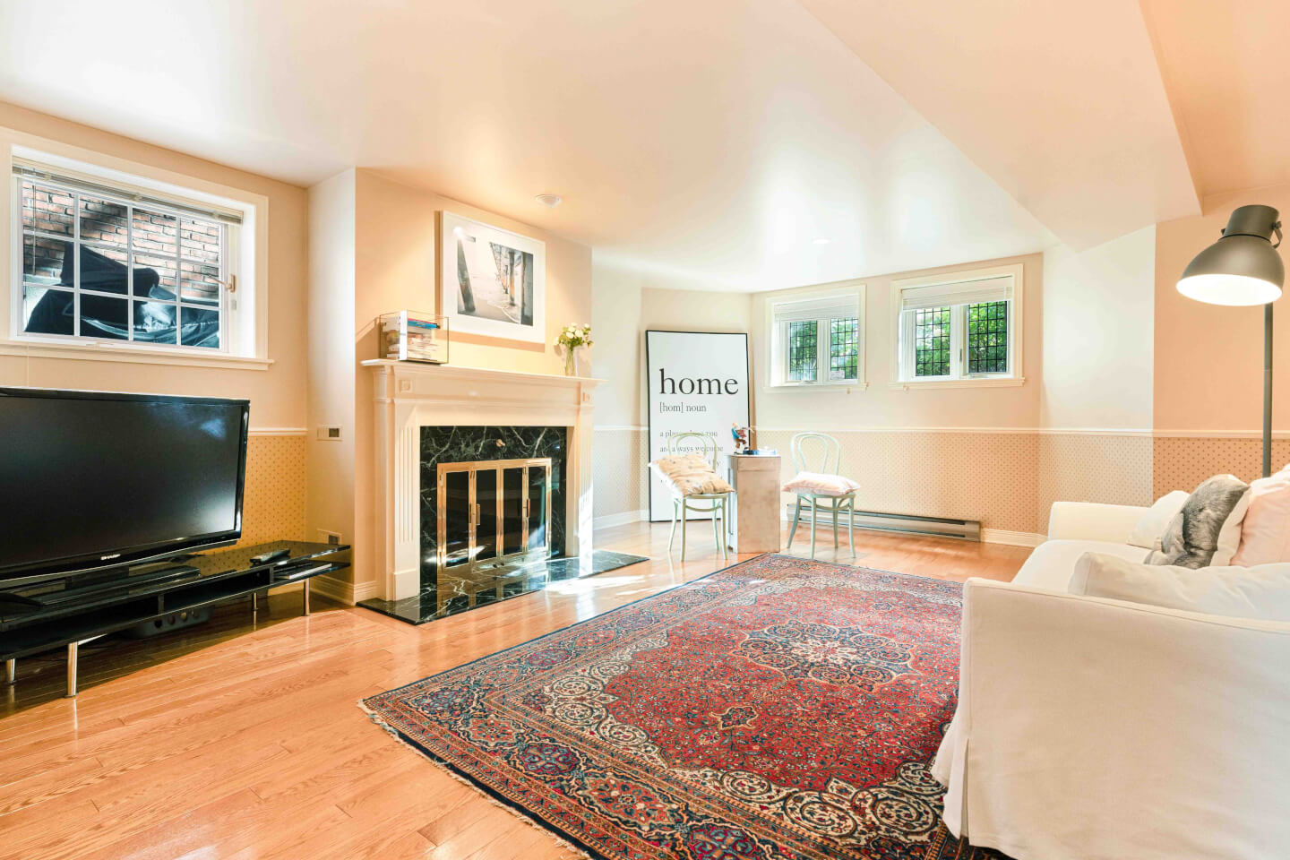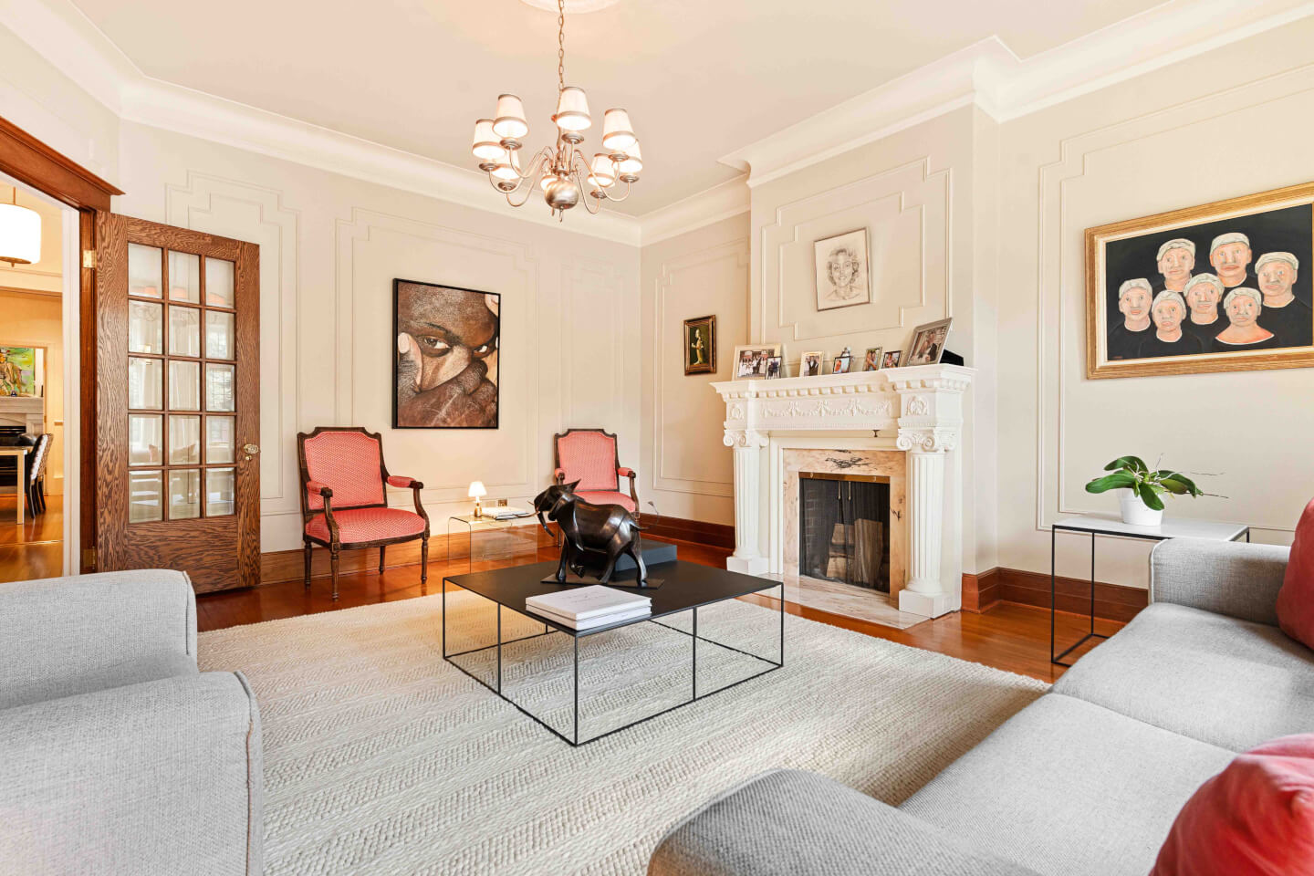 Salon, fenestration en baie, détails de moulures murales & foyer 1930