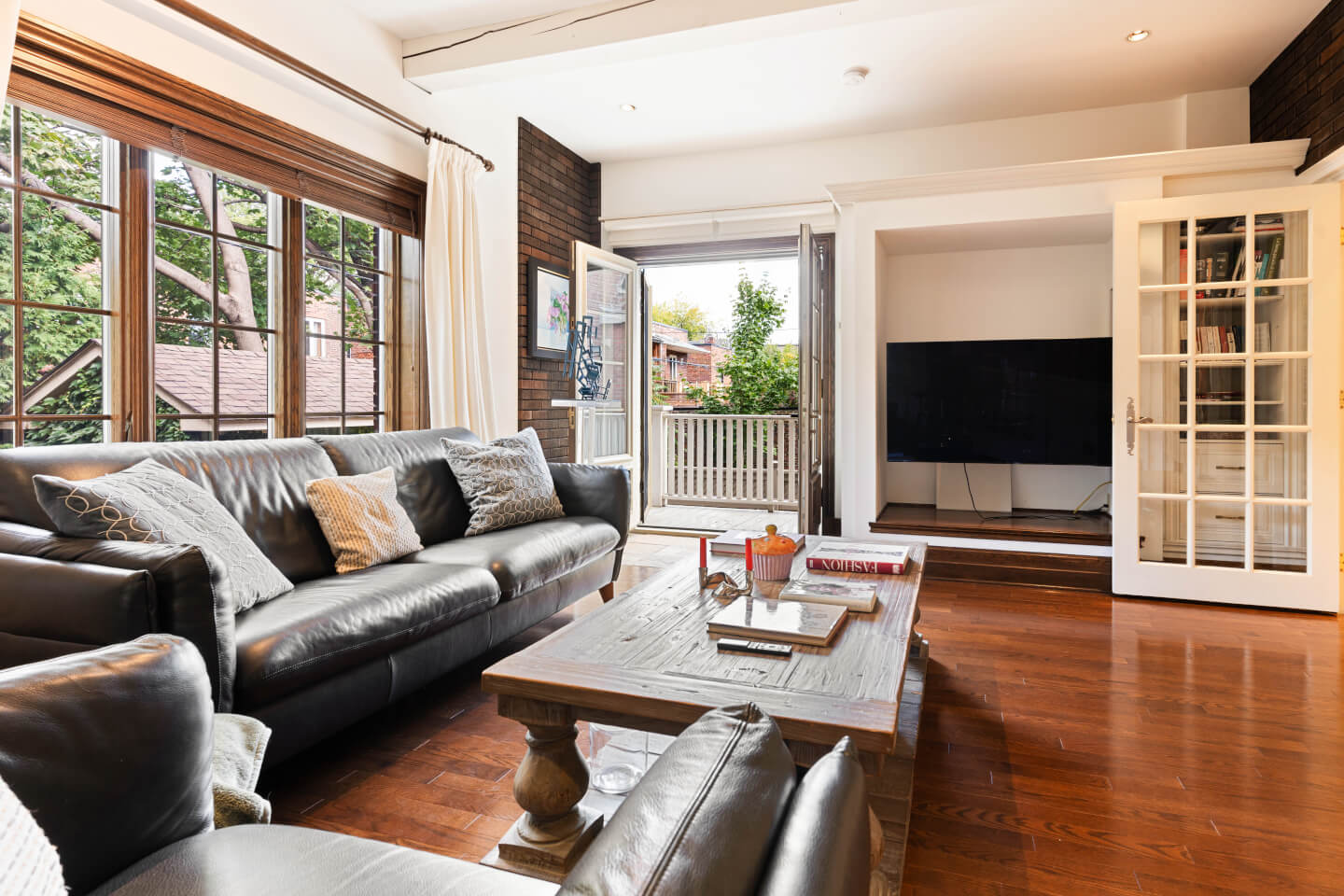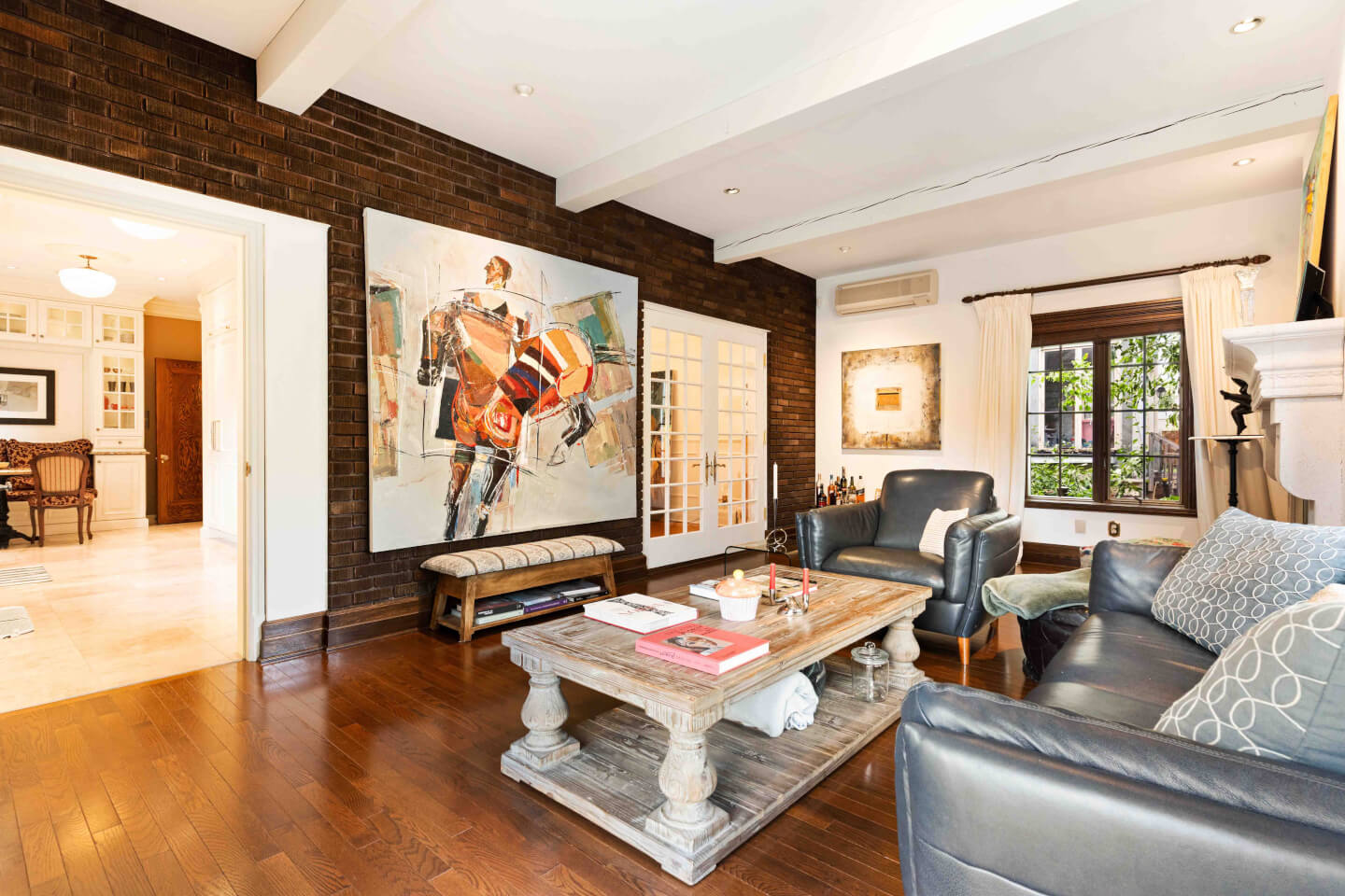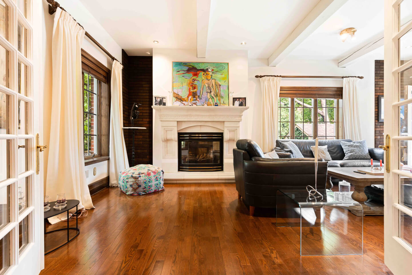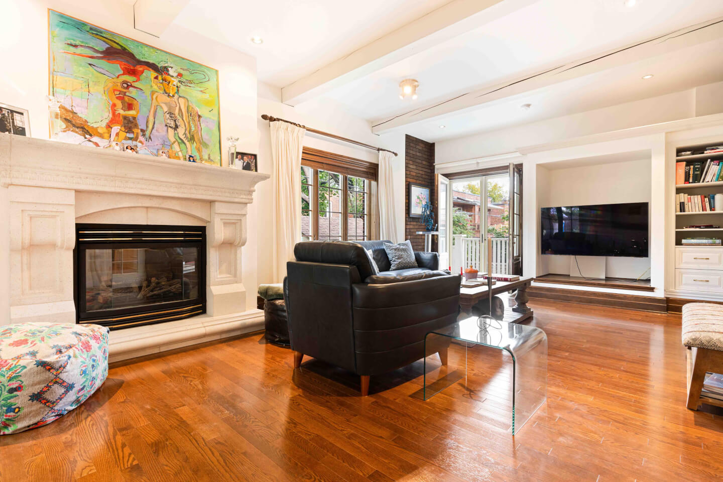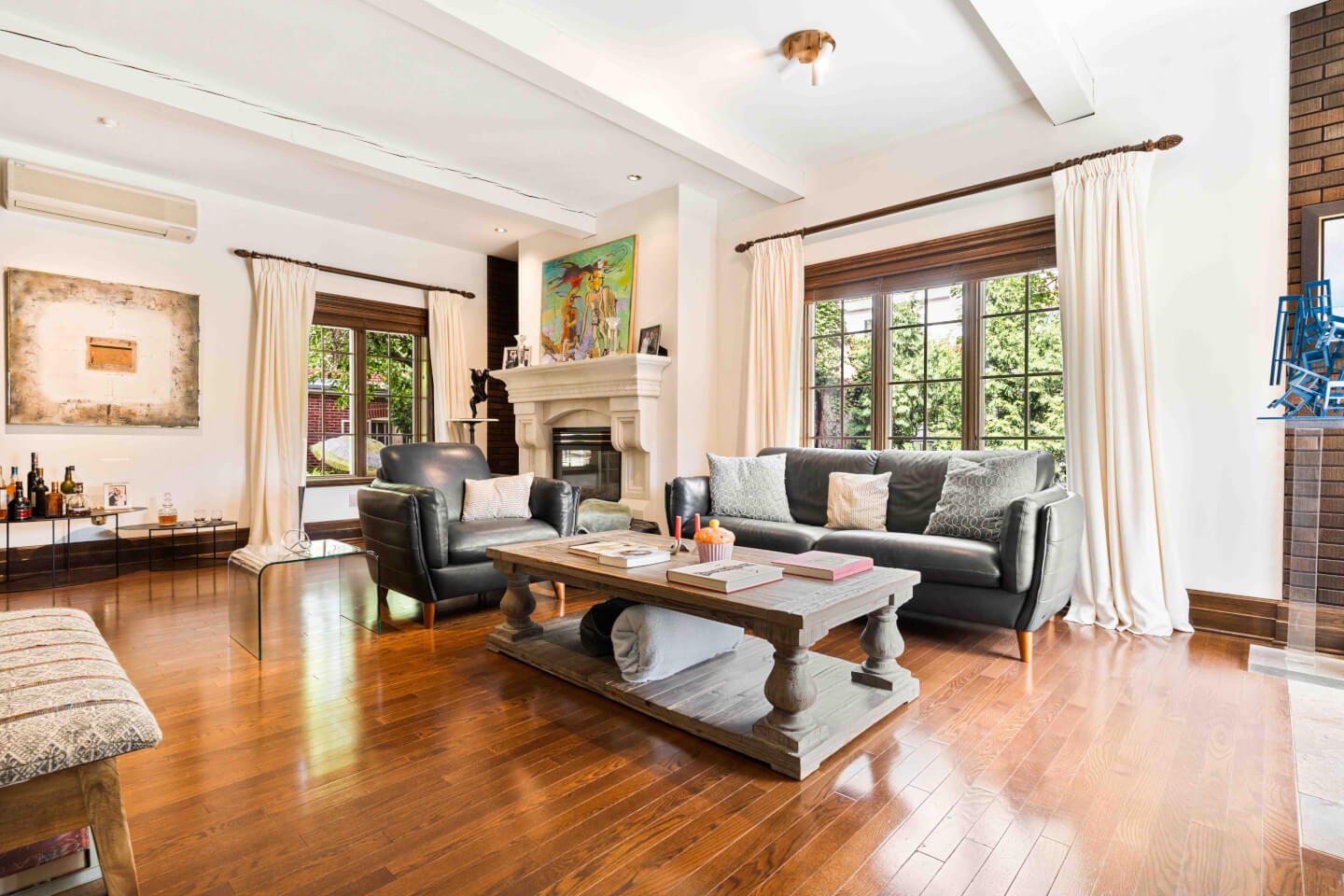 RDC; S. familiale, fenestration abondante, poutres au plafond, AC, foyer au gaz & superbe manteau, + accès au jardin
