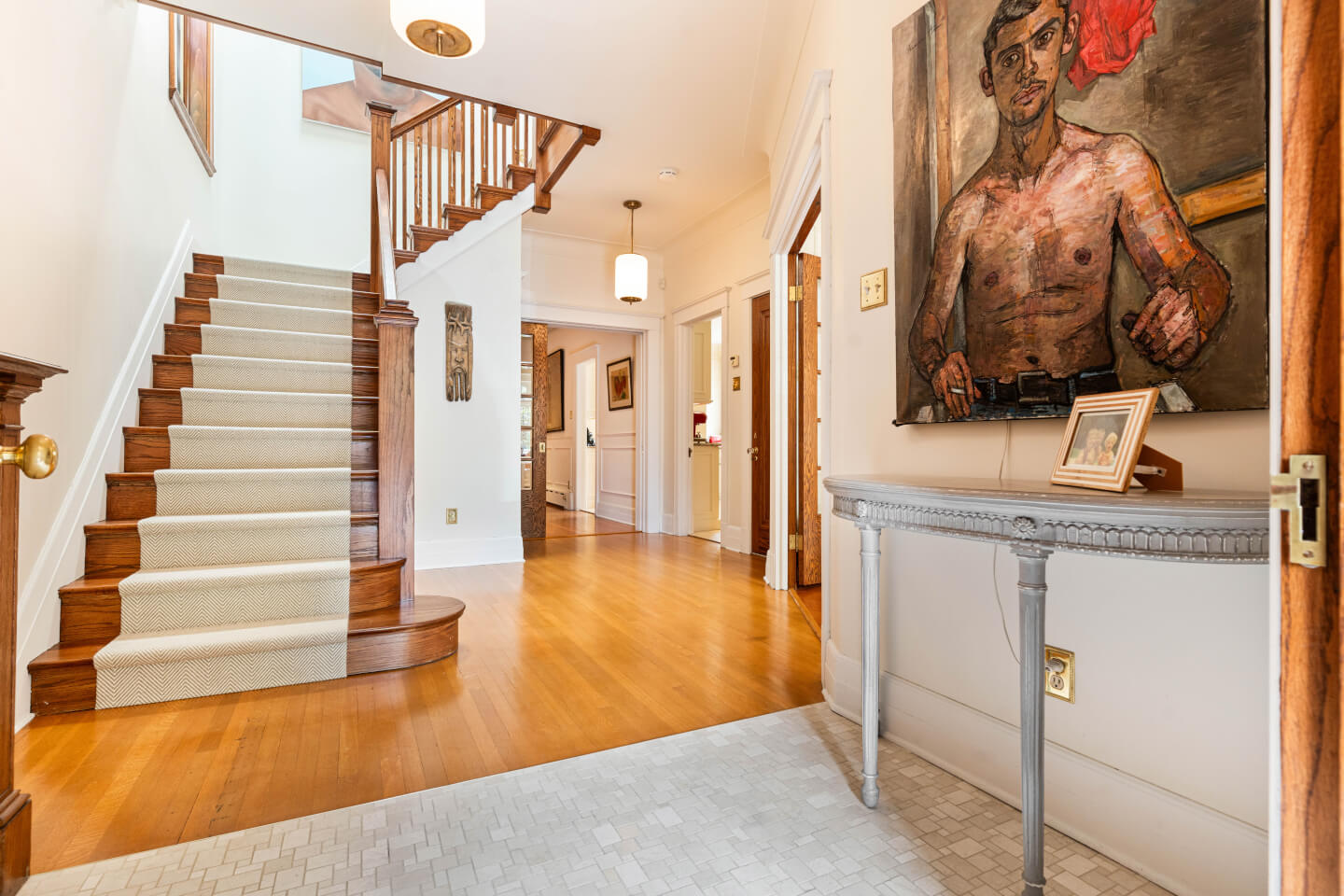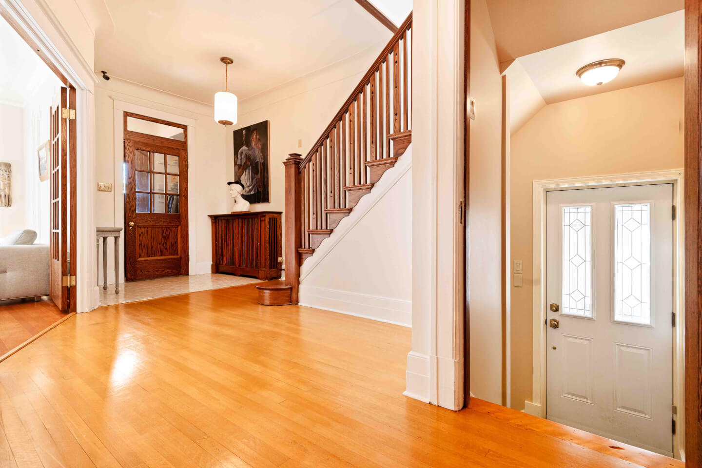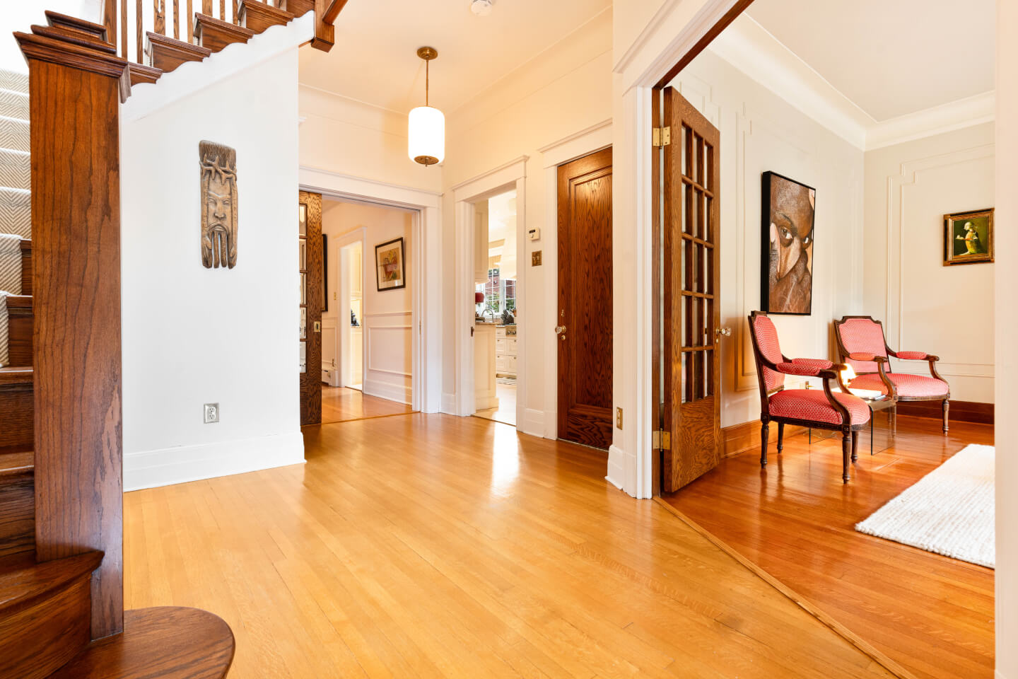 Spacieux hall d’entrée à plan croisé, ouvert sur son escalier, inondé de lumière