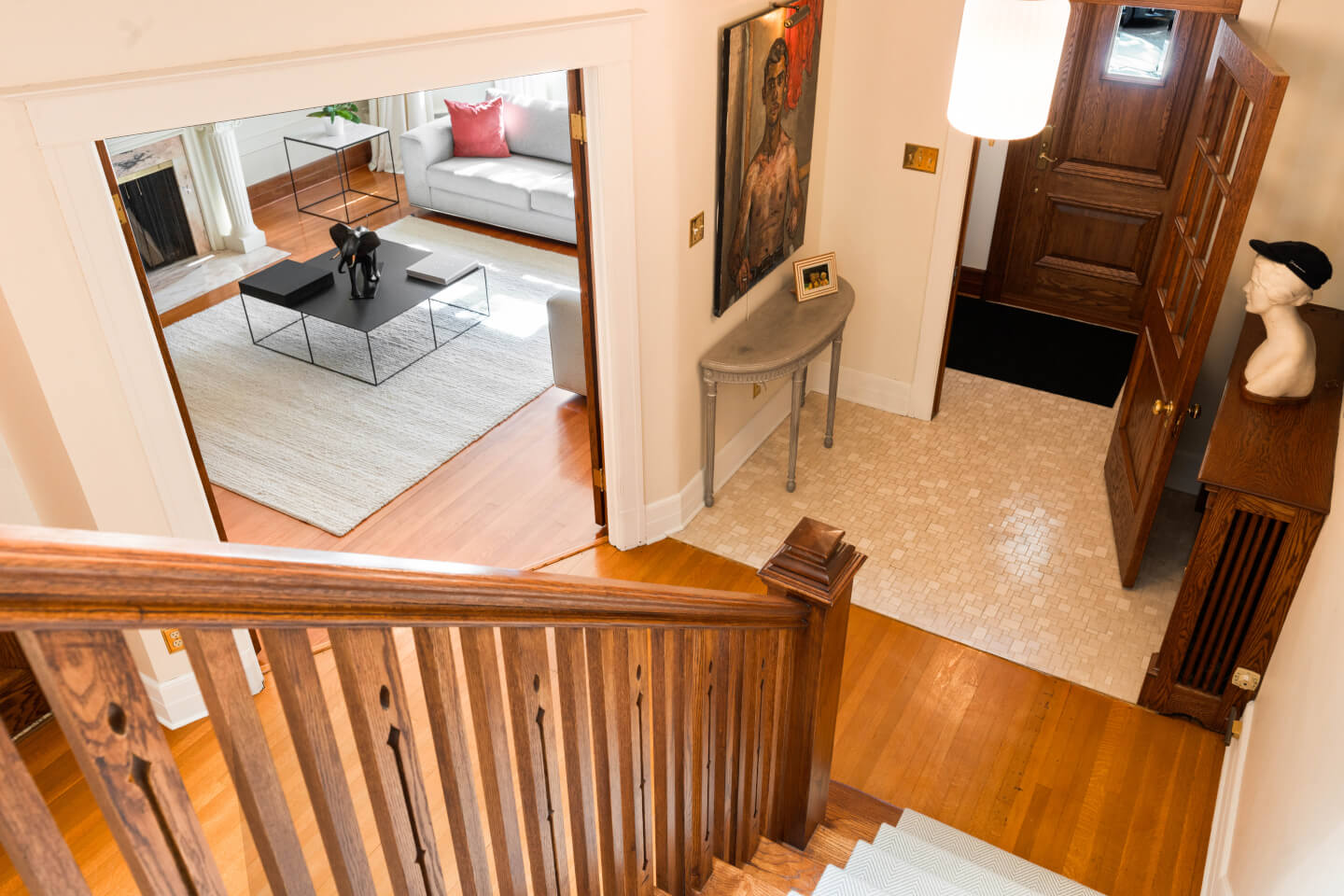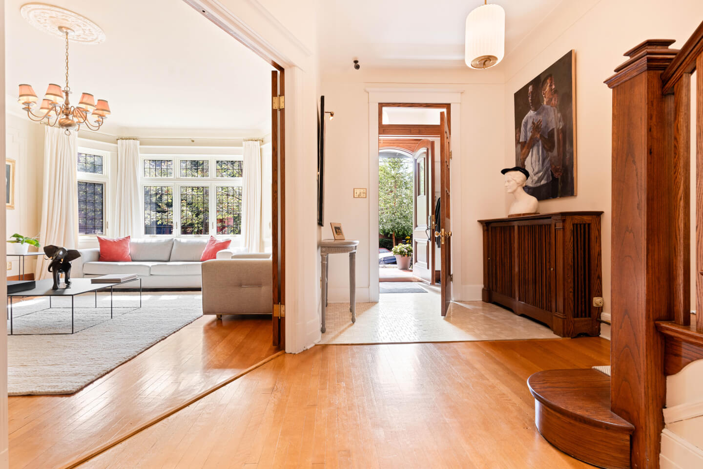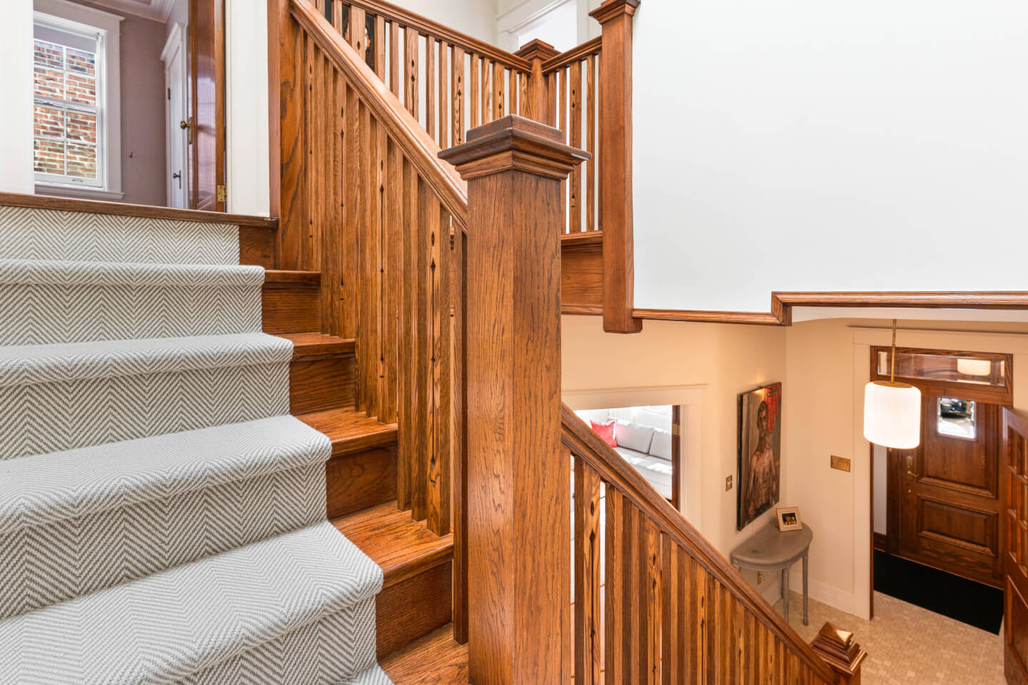 Spacieux hall d’entrée à plan croisé, ouvert sur son escalier, inondé de lumière
