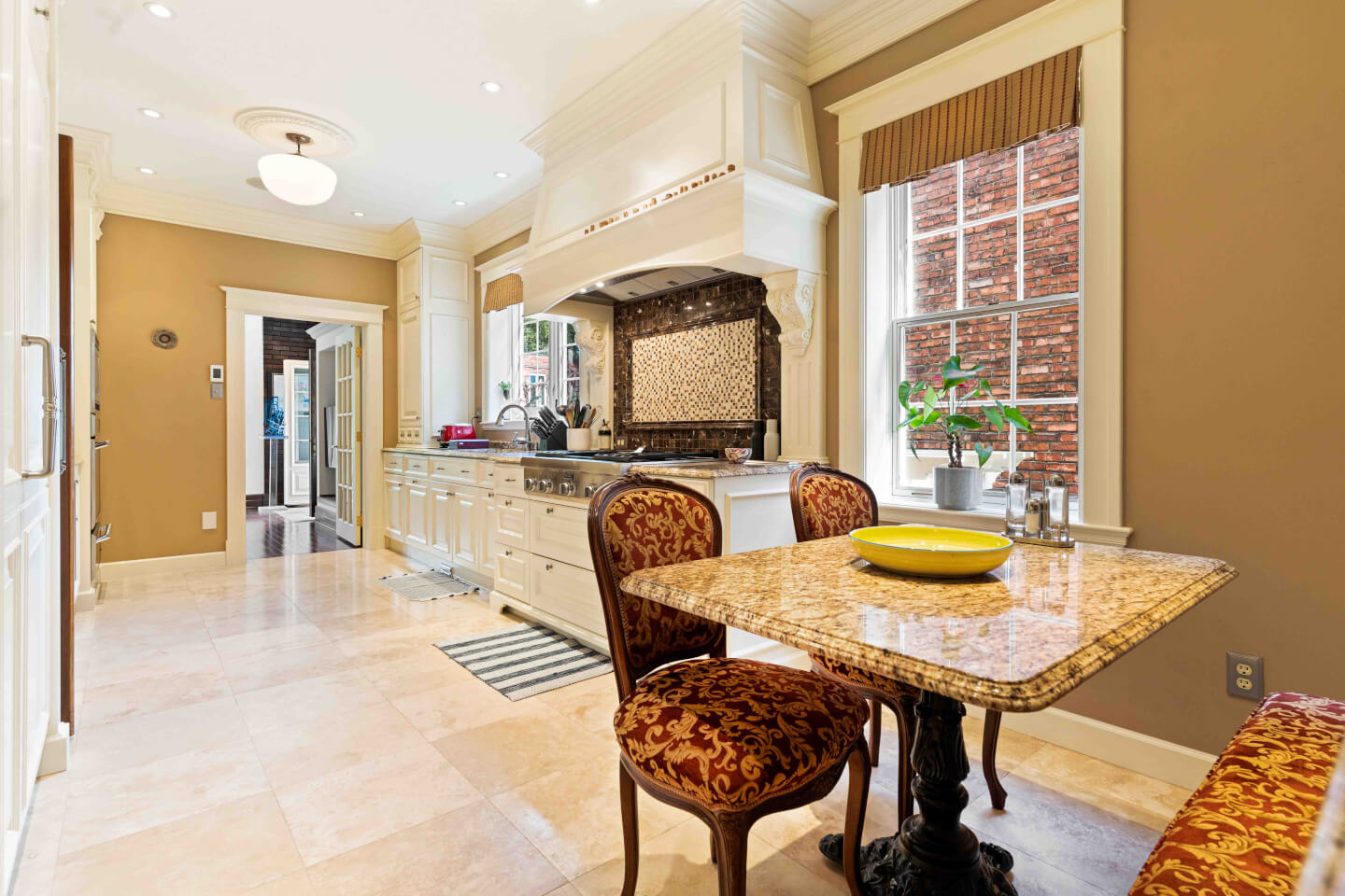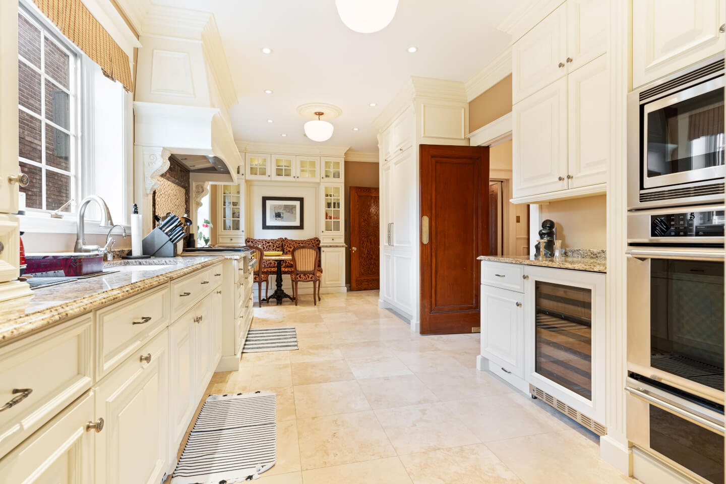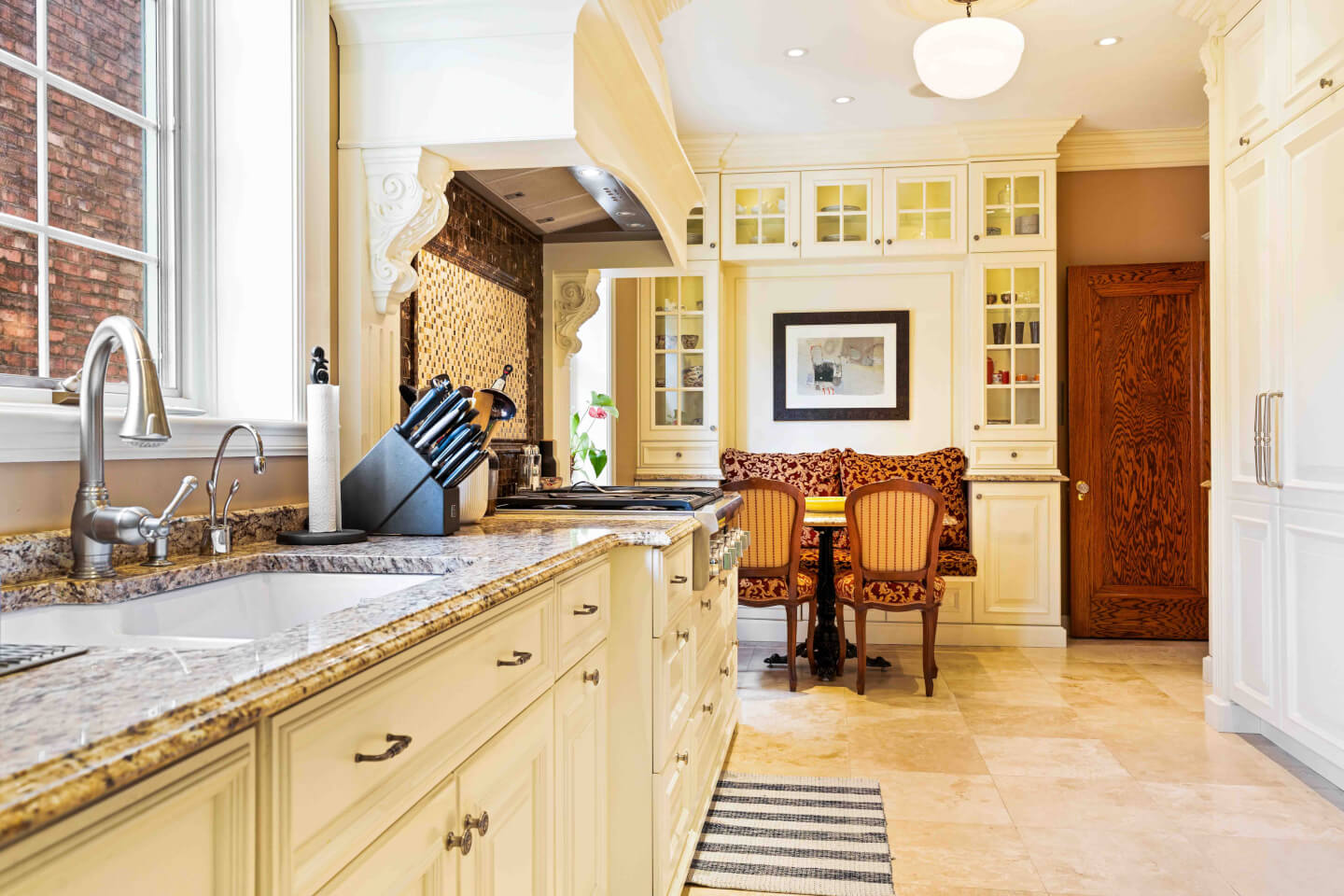 Superbe & grande cuisine design; Armoires Tendance Concept offrant son coin dînette et banquette, appareils haute gamme, comptoir de granit & plancher travertin radiant
