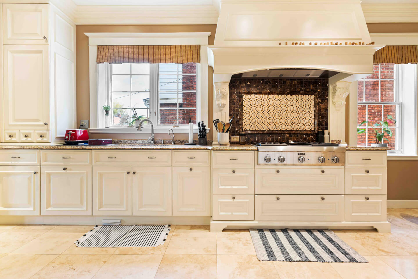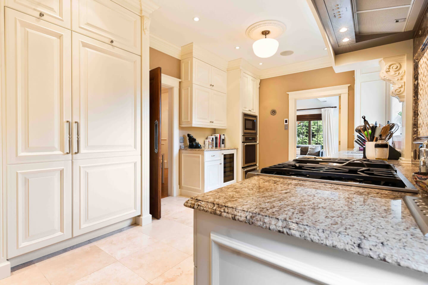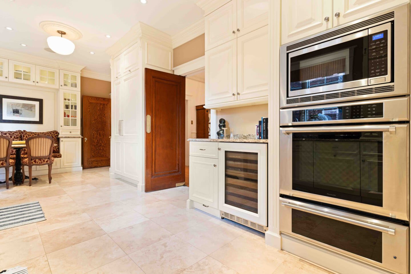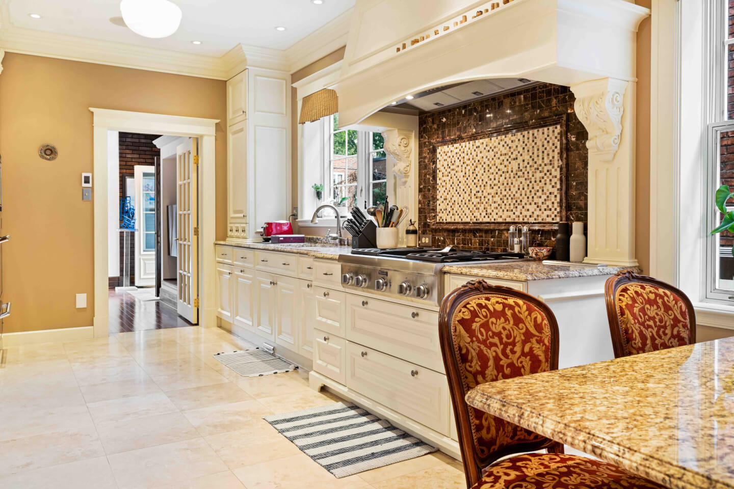 Superbe & grande cuisine design; Armoires Tendance Concept offrant son coin dînette et banquette, appareils haute gamme, comptoir de granit & plancher travertin radiant
